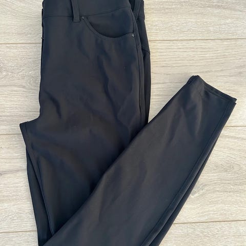 Lekker bukse med en glatt overflate og superfin passform. Lommer foran og pyntelommer bak i skinndetaljer. Glidelås på lommene foran og nederst på leggene. God stretch. Normal på størrelse.