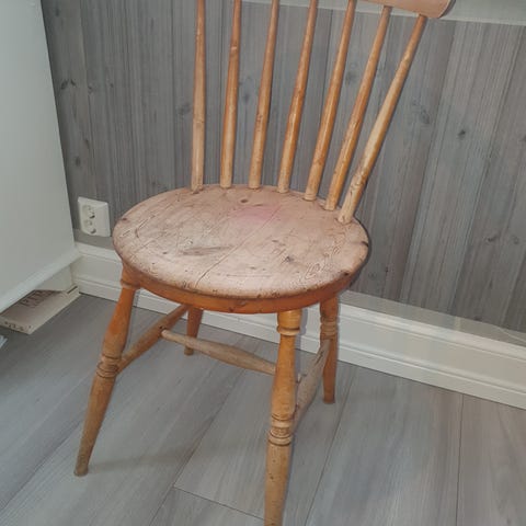 Sjarmerende pinnestol av den gamle typen. Med malingsflekker. Kan fint overmales, men sjarmen er der nå. Stødig.