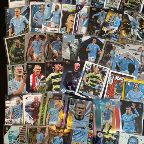Mange ulike fotballkort av Erling Haaland i Borussia Dortmund, Norge og Manchester City drakt selges!