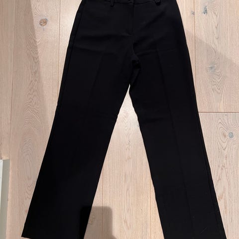 Brun Sandwich bukse i 70 % bomull og 30 % nylon.2 lommer foran med glidlås og 2 knapper i linningen.Kan brukes belte på den.Liten skinnkant nederst på begge ben.Lengden er 78 cm fra skrittet og ned.