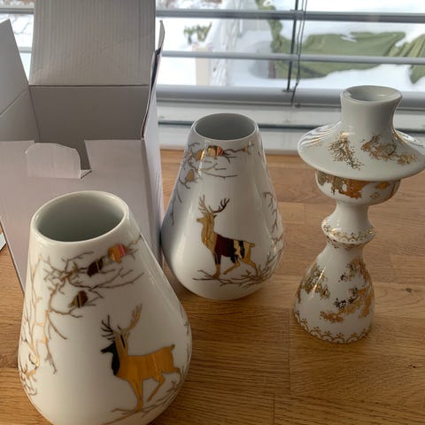 Dette er som nytt! Stor vase, lysestake og krukke med lokk