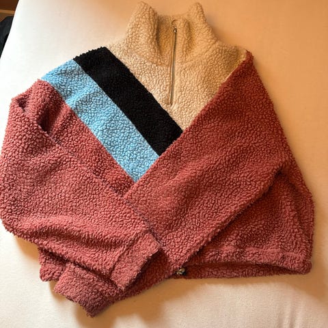 Fra H&M Divided. Marineblå med hvit, lysblå og vinrød detaljer. Glidelås i hals. Kort modell. Pent brukt.