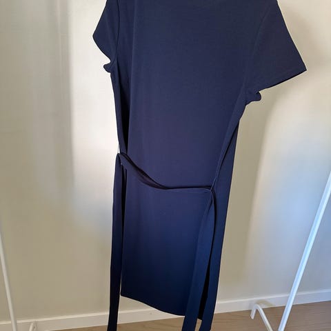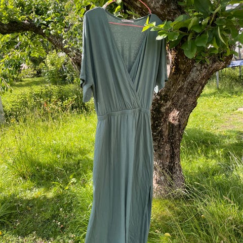 Grønn kjole med blomsterprint. Kjolen er foret bortsett fra i ermene som er lange. Den har knyte belte.