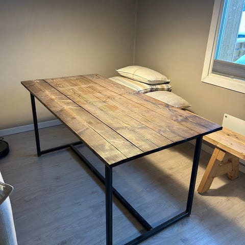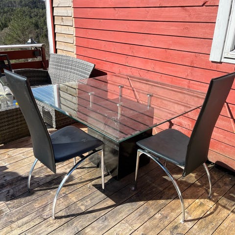 Pent, allsidig og solid bord. Metall /alu understell. Frostet glassplate. Lett å rengjøre☺️