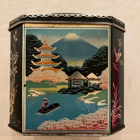 To pene, eldre tebokser med japansk motiv. Høyde 13 cm, lengde 13,5 cm, bredde 10 cm. Boksene er i svært god stand. Selges for 200,- pr stk