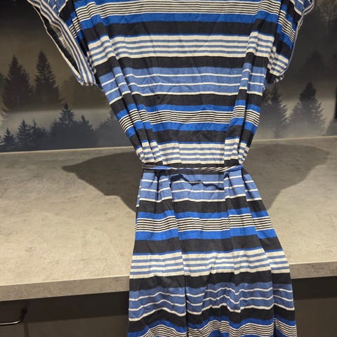 Deilig sommerkjole fra Ichi selges. Maritim, blåstripete og splitt i ene siden. Åpen rygg. Kan sende fler bilder på forespørsel. Størrelse small, men passer nok dersom du bruker medium også da den er stretchy i stoffet.