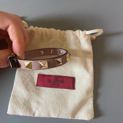 Selger dette nydelige Rockstud armbåndet fra Valentino i fargen poudre. Det er kun brukt to ganger og selges derfor. Alt av dustbag, eske, pose og kvittering medfølger. Bilde nr 2 viser fargen best. Kjøpt på Valentino i Oslo🤍