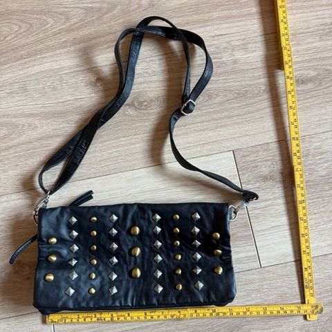 Kjempetøff veske med spikes og reim, pent brukt, kan sendes. Den er ca. 33,5 cm bred og 22 cm høy. 99,- + frakt.