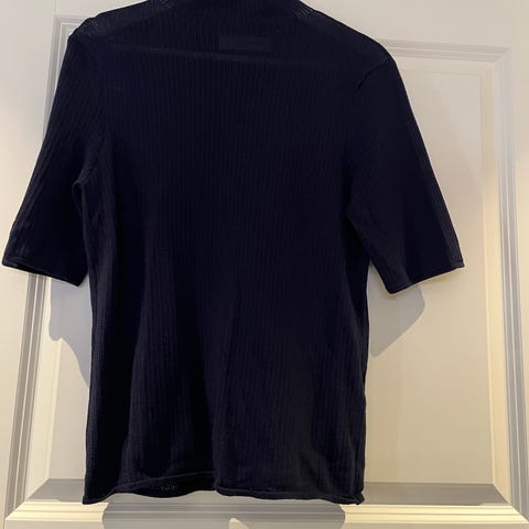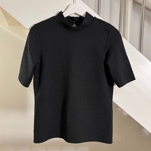Svart t-skjorte bluse fra Lindex m stripestruktur i stoffet, puffermer, litt høyere halslinning og halvlange (til albuen) ermer. Str. XS og smal modell som sitter pent på. Pent brukt.