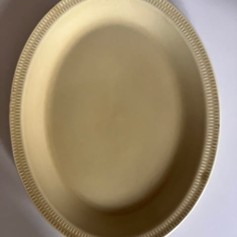 Fatet er 34 x 26 cm . Det har noen bruksspor og et ørlite nagg på undersiden. Kr 150.-. Porto kr 69.-
