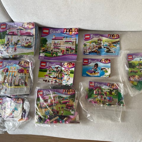 Diverse Lego friends selges. Alle er med oppskriftsbok, ligger i poser klar til å legge sammen. Prisen er samlet for alle. Ett byggsett uten bok, finnes på app.