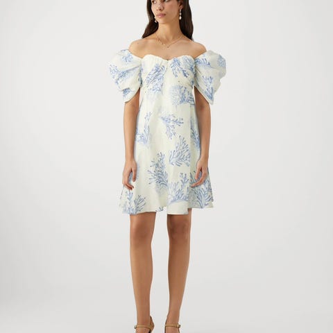 Ganni kjole - JACQUARD PUFF SLEEVES MINI DRESS SKY BLUE