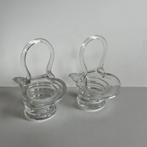Søtt kakefat med stett i glass. Fatet er dekorert med blå og frostede blomster (krokus). Stettefatet er produsent av tyske Walther glas.