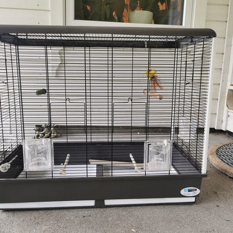 Stor fuglebur som er pent brukt og i god stand. Følger med diverse nytt og pent brukte leker . 2 UV lamper. Se bilder for info. Må hentes . Prisen er stående. Perfekt for små papegøyer eller en kråke . Ca 140cm høy, 70cm bred, 46cm dyp.