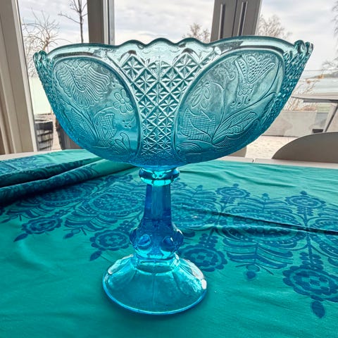 Pressglass skål fra Glimma glasbruk. Koboltblå