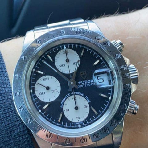 Her kommer en sjelden perle her på berget - en vaskeekte "Big Block" med reverse panda layout og sort bakelite bezel. Dette er den mest ettertraktede kombinasjonen av tallskive og bezel i den siste generasjonen av Tudor Oysterdate Chronograph som hadde "Big Block" urkasse og plexiglass (791x0, lansert i 1989). Dette er en tidlig utgave av 79160 som kjennetegnes ved at den har matt sort tallskive, T SWISS T markering klokka 6, rute rundt datovinduet og avfasede timemarkører.
