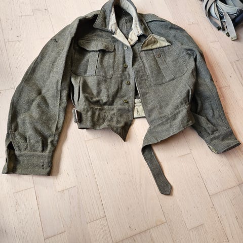 Fransk alpejeger uniformsbukse datert 1940. Av en eller annen grunn ble det sendt et parti slike for bruk av den Norske Brigaden i Scotland under krigen. De har i tillegg til de Franske stemplinger også merket NA for Norwegian Army. Disse blå buksene er meget sjeldne ute i Europa.