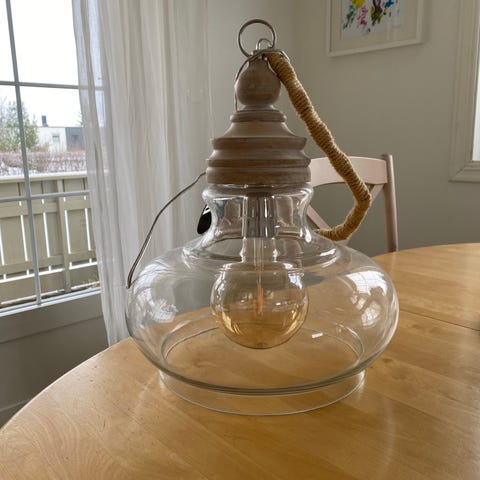 Selger denne fine glasslampe da den ikke helt passet ind alligevel. Helt ny, så vidt tatt ut av boksen den kom i. For mål og nypris, se bilder. Er lysbrun/rav i fargen. Nydelig, elegant lampe. Selges for 750kr. Må hentes i Nittedal.