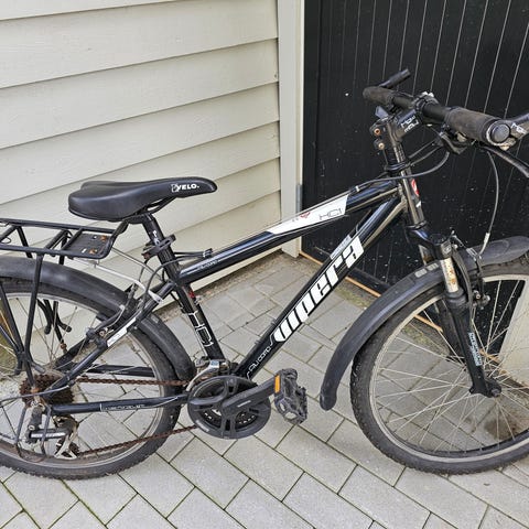 God barnesykkel, som trenger en liten vask og kanskje nye pedaler (blitt brukt som den er). Den har en ekstra lett ramme for å gi sykkelglede. Det ytterste på pedalene har falt av, kan brukes som den er, men er mulig å bytte. Barna har vokst fra den, og den har samlet støv i garasjen og trenger nok en vask og kanskje litt olje. Fungerer ellers veldig fint, og er en god sykkel.