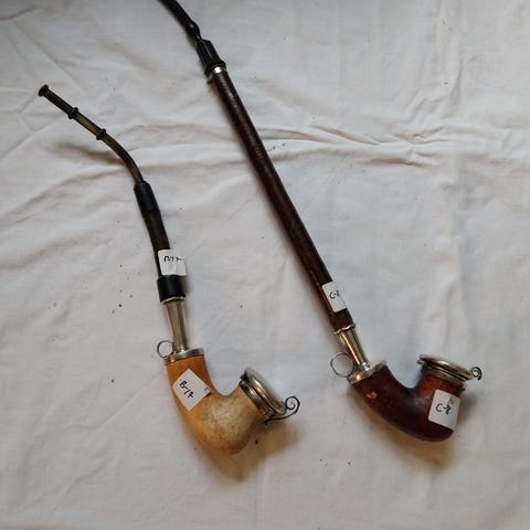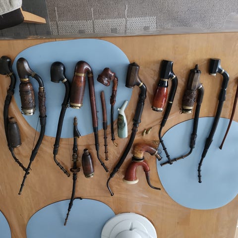 Flott samling på totalt 13 piper pluss ett askebeger i messing , lokk bør loddes på det.