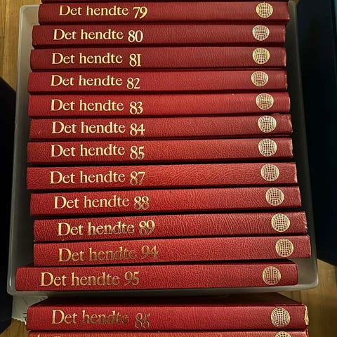 Det hendte 1976, 1978-1985, i alt 9 bind. Veier 15kg., så må sendes enten i 2 pakker til 125,-+ 69,-=194,- eller 1 pakke inntil 20kg. for 219,-.