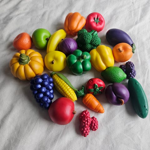 Vi kjøpte en stor pakke med mange varianter av frukt og grønnsaker til barnet, hvor av noen var dobbelt, de dobble tingene selger jeg, uten at de har vært i bruk.