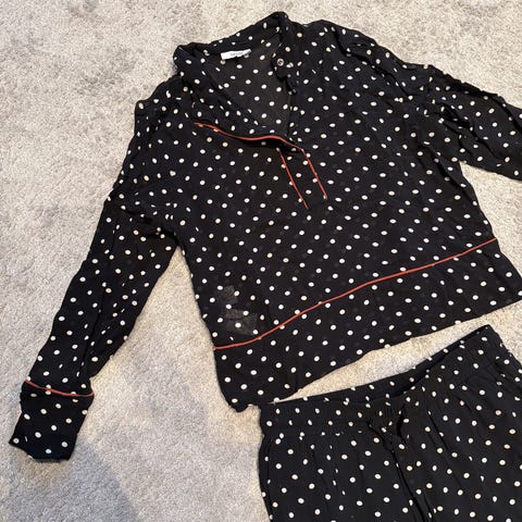 Selger dette flotte settet fra Ganni som består av 92% silke og 8% elastane. Toppen er i str. 38, mens buksen er str. 36. De er blitt elsket og brukt og det er noen tegn til det, men de har ingen hull eller liknende. Det er fortsatt mye liv igjen i disse, og selger med tungt hjerte fordi jeg rett og slett ikke passer de lenger. Selges som et sett!