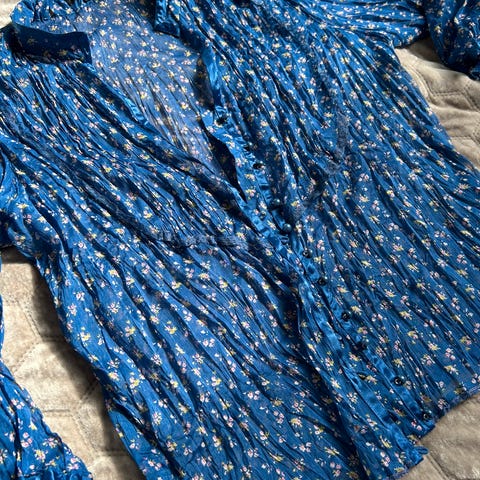 Blusen er pent og lite brukt. Ingen lapp med størrelse, men det er trolig M/L. Brystmål fra armhule til armhule er 57 cm, og lengde fra skulder og ned er 51 cm. Ingen lapp med materiale.