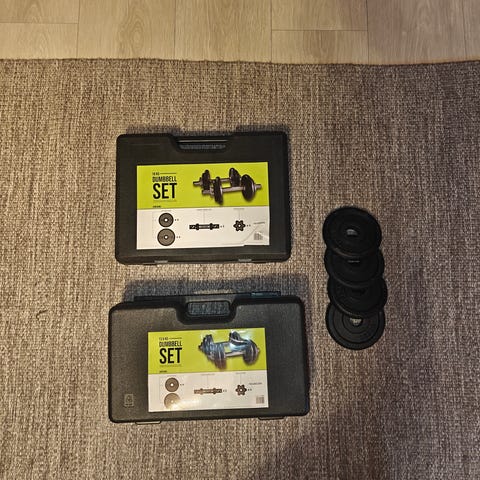 Justerbar trenings manualer 20kg selges. Disse vektene kan man justere opp og ned alt ettersom ønsket intensitet på treningsøkten.