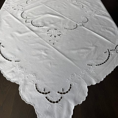 Nydelig hvit eldre brodert duk med åpen mønster. Har ikke årstall hvor gammel den kan være, men pent holdt. Arvegods.