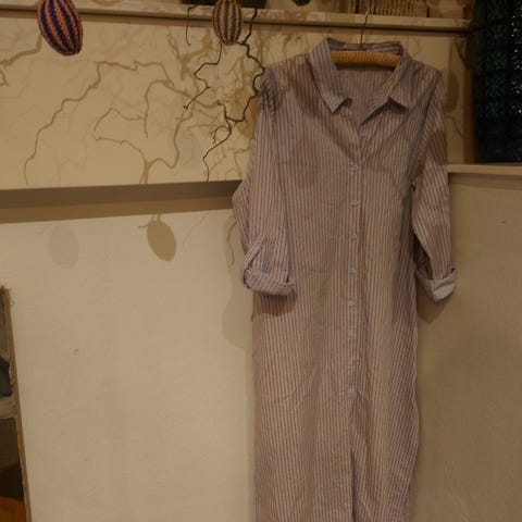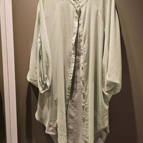 Lekker tunika i 100% silke fra Bitte Kai Rand. Den er i str. 34 (men romslig), og fargene er hvit og gråsvart. Tunikaen har høye splitter i sidene og forseggjorte ermer med knepping. Knappene er i perlemor. Den er ubrukt og som ny. Selges for kr. 800.