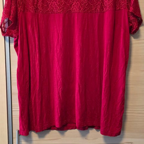 Burgunderrød langermet genser med blondearmer og blondekrage.