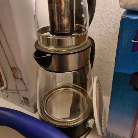 1.5 l kapasitet i vannkoker og 0,7 l kapasitet tekanne i glass. Kan koke vann eller lage te. Den kan holde vannet varmt.