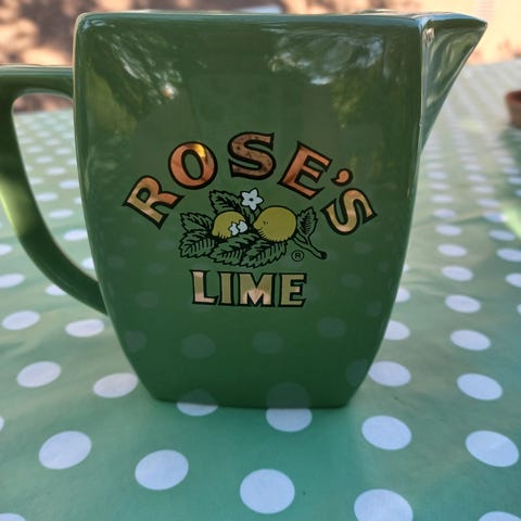 2. Flott grønn vannmugge fra Wade med reklame for Rose's Lime. Ca 13cm høy. Lite slitasje. 200kr. Solgt