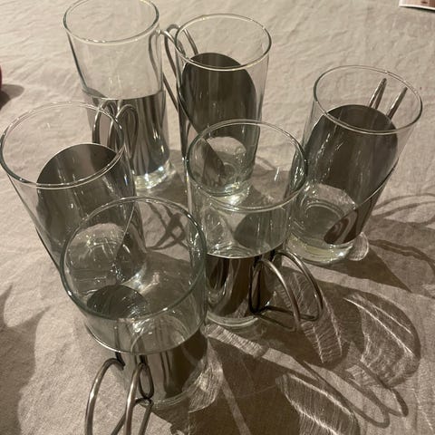 6 flotte gamle likør/shotteglass med Luster dekor imetallstativ. Glassene har diameter 4 cm og høyde 5,5cm. Ingen skader. Litt slitasje på stativet. Stativet er ca 21cm høyt. Kan hentes i Stokke i Vestfold eller sendes mot porto.