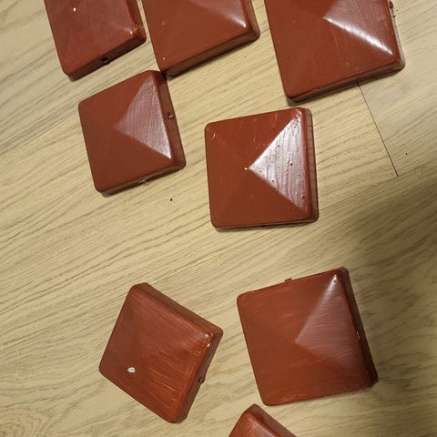 25 stolpehatter fra Biltema. Har vært sprøytelakkert hvitt, men er renset. Er noen hvite prikker her og der. Nypris pr. stolpehatt er 29.90; selges samlet for 400.-