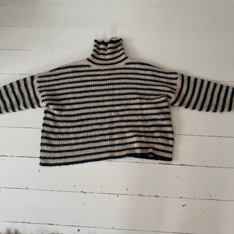 Gråstrpet deilig strikkegenser med vide armer størrelse M selges. Brukt 2 ganger fremstår som ny. Hbo 250,-