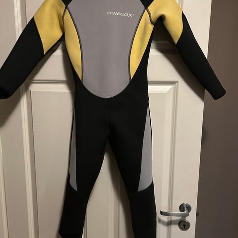Lite brukt våtdrakt for barn, med korte armer og bein. Glidelås på ryggen. Våtdrakta er alltid skylt i ferskvann etter bruk.