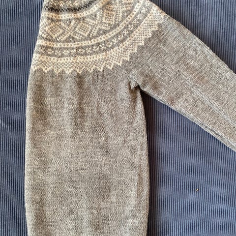 Setesdalsgenser med rundfelling og forhøyning i nakken,som gjør at genseren sitter penere på. Strikket i Sterk fra «du store alpakka».