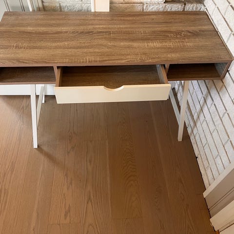 Et pent skrivebord laget av slitesterk bambus. Ser bra ut fra alle vinkler, slik at du kan i plassere det midt i rommet hvis det passer deg best. Tre skuffer i A4-størrelse til oppbevaring av papir og andre mindre ting.