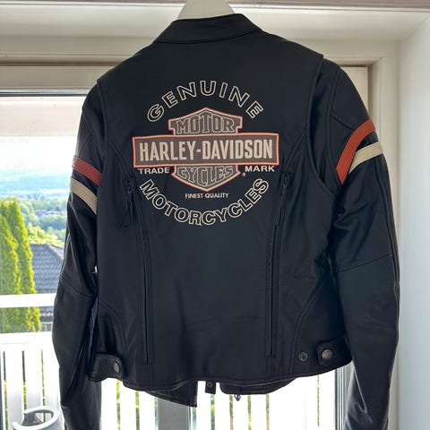 Selger min fine Harley Davidson Skinnjakke str L, da den har krympet i skapet. Den er veldig lite brukt og har mykt skinn. Lomme for beskyttelse i ryggen. Lufting i sider/arm, samt lufting foran og bak. Damemodell. Hentes helst i Tistedal, Halden. Bør vel prøves først.