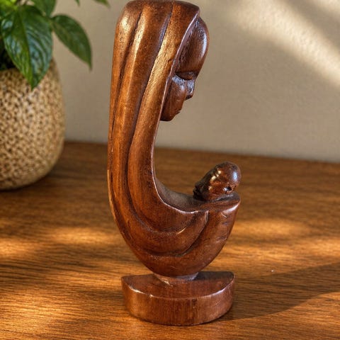 Vakker trefigur 17cm høy og ca 5cm i diameter. Familie med mor, barn og far, antagelig Maria med Jesusbarnet og Josef men behøver ikke nødvendigvis symbolisere noe religiøst. Kan også bare være en almindelig familie. NB! Har noen naturlige sprekker på baksiden (se bilder). Limrester under. Ellers i fin stand.