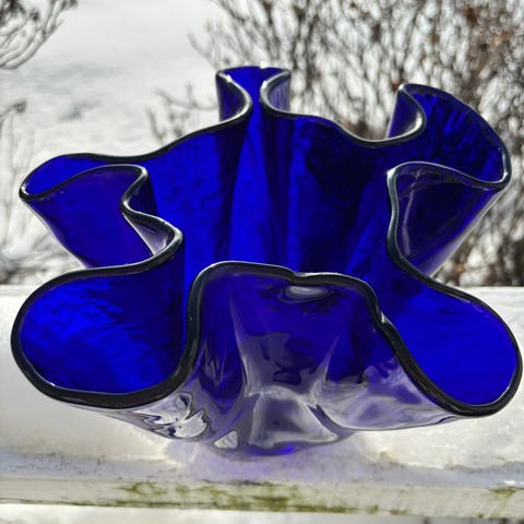 Nydelig eldre munblåst tulipan vase i hvitt og blått
