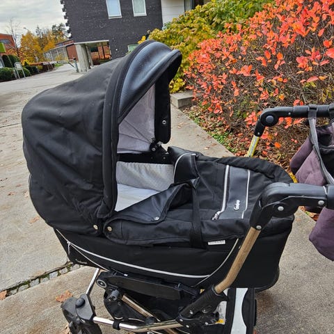 Pent brukt barnevogn med ligge- og sittedel. Kommer også med myggnett og regntrekk, samt en solparaply.