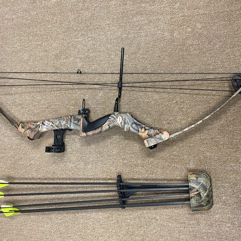 330 f/s -75-80 prosent let off-komplett pakke med bue med sikte (5 pin fiberoptisk), whiskers på strengen,, kogger, avtrekker, tolv piler med spisser (har jaktpiler/spisser også om interessant).