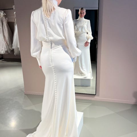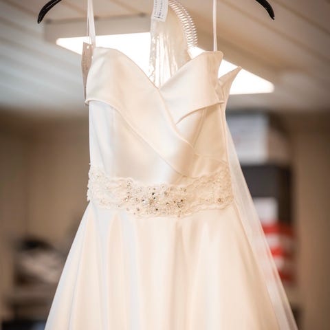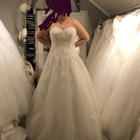 Selger en helt ny og ubrukt brudekjole av merket Cynthia 1916, størrelse 34. Kjolen er kjøpt hos Brudehuset Hamar og har kun blitt prøvd på en gang – aldri brukt i bryllup.