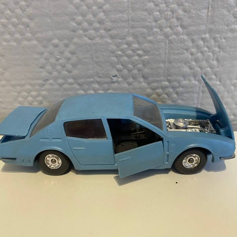 Vintage modellbil i metall, skala 1:43, laget i Sovjetunionen (USSR). Antakelig en kopi av Mebetoys Ferrari P4 A27. Brukt, men i god stand. Perfekt for samlere av retro biler eller Østblokk-leker.