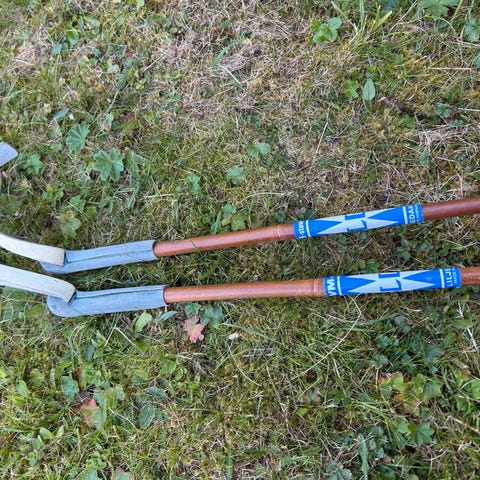 Mange vintage skistaver og et par hoppski