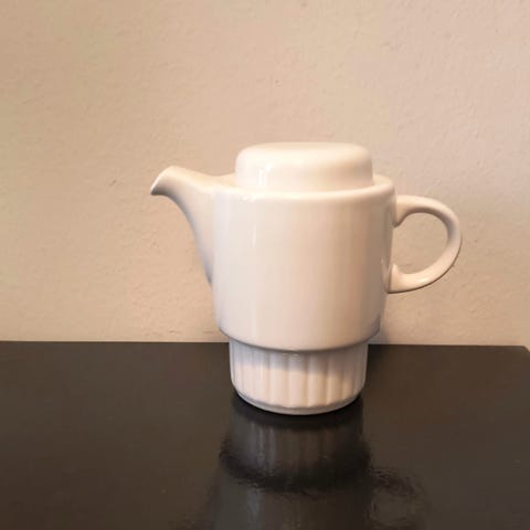 Tekopp med asjett fra Stavangerflint. Dette skal være modellserie Svithun, og mønsteret går under Jadar. Oftere å se i sort på grønn bunn, her i blått på hvit. Mye krakelering, men uten skår eller sprekker. 150 kr