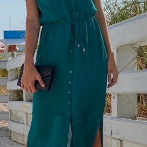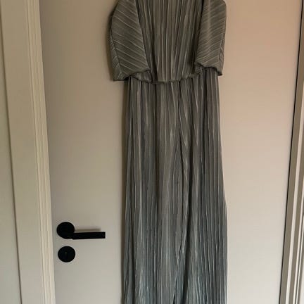 Nydelig lang kjole med åpen rygg og skjult strikk i livet. Har et lite merke nederst på skjørtet, se bilde.